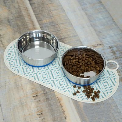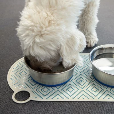 Esta alfombrilla para comederos y bebederos de perros y gatos es muy práctica para evitar que el suelo se ensucie con restos de comida o con salpicaduras de agua. Está fabricada con silicona blanda inocua, un material que se adhiere a las superficies lisas y evita que se deslice. Resulta muy fácil de limpiar gracias a su superficie lisa; puedes tanto lavarla a mano como introducirla en el lavaplatos. Como cuenta con un práctico anillo, puedes colgarla para que se seque más rápidamente. Otra de sus ventajas es que es enrollable, por lo que puede guardarse en un cajón sin que apenas ocupe espacio.