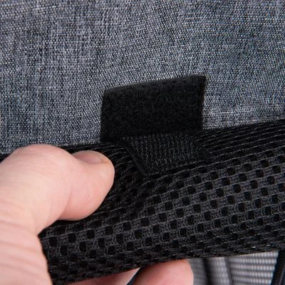- Puerta frontal segura: con mosquetón para enganchar las cremalleras para que no pueda abrirse desde el interior