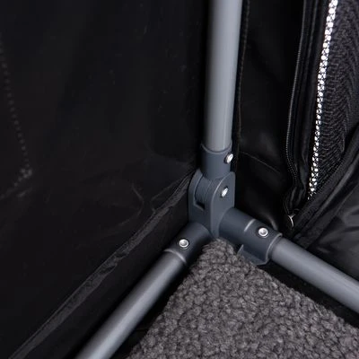 La caseta plegable Pet Home posee una terraza cubierta desplegable que aumenta la superficie de la caseta en casi el doble de su tamaño. El techo de red enrollable permite la entrada de luz y de aire. Las puertas laterales se pueden enrollar y sujetar con velcro.