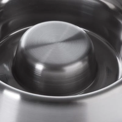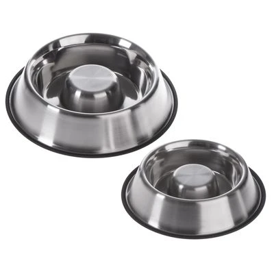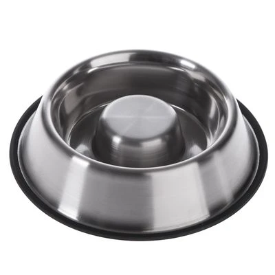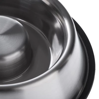 Comedero de acero para perros. Posee una elevación en el centro que ralentiza la ingesta de comida. Con anillo de goma antideslizante de calidad premium en la base. Apto para lavavajillas.