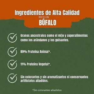 - Contenido alto de carne: sabroso búfalo como ingrediente principal